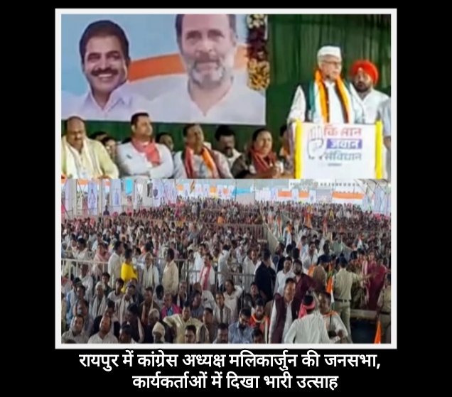 रायपुर/छत्तीसगढ़: सोमवार को राजधानी रायपुर के साइंस कॉलेज मैदान में मूसलाधार बारिश के बावजूद कांग्रेस द्वारा आयोजित जनसभा में जनसैलाब उमड़ पड़ा। इस भीड़ ने प्रदेश में विपक्षी दल कांग्रेस के कार्यकर्ताओं में नया उत्साह भर दिया। कांग्रेस अध्यक्ष मल्लिकार्जुन खड़गे ने जब जनसभा को संबोधित किया इस अवसर पर कांग्रेस कार्यकर्ता कांग्रेस पार्टी जिंदाबाद जिंदाबाद के गगनभेदी नारे लगाते रहे।