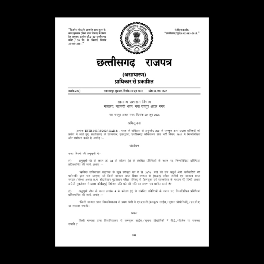 Chhattisgarh News: छत्तीसगढ़ में चतुर्थ श्रेणी कर्मचारियों के लिए पदोन्नति के नियमों में बदलाव किया गया है, जिससे उनकी पदोन्नति की राहें लगभग बंद हो गई हैं। सामान्य प्रशासन विभाग ने राजपत्र में अधिसूचना प्रकाशित कर दी है, जिसमें चतुर्थ श्रेणी से तृतीय श्रेणी के पद पर पदोन्नति के लिए कंप्यूटर डिग्री की अनिवार्यता जोड़ दी गई है।