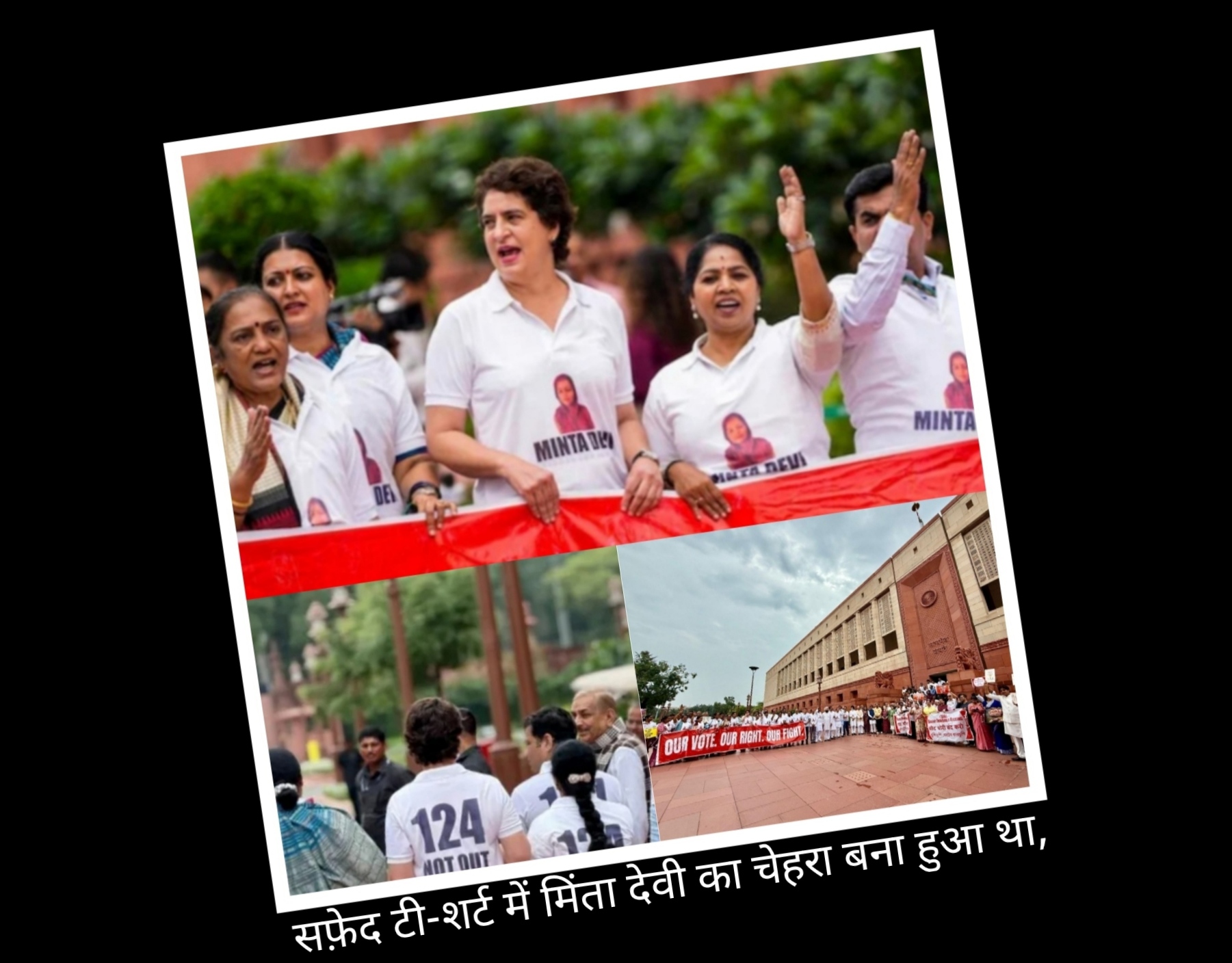 नई दिल्ली:विपक्षी सांसदों ने ‘मिंता देवी’ नाम की एक महिला की तस्वीर वाली सफ़ेद टी-शर्ट पहनकर विरोध प्रदर्शन किया, जिससे लोगों का खूब ध्यान आकर्षित हुआ। शर्ट के पीछे मोटे अक्षरों में “124, नॉट आउट” लिखा था।