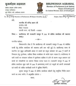 सांसद बृजमोहन अग्रवाल ने केंद्रीय शिक्षा मंत्री को पत्र लिखकर रायपुर में CBSE के क्षेत्रीय कार्यालय की स्थापना की मांग की थी। उनके प्रयासों का परिणाम अब सामने आया है, जिससे छत्तीसगढ़ की शिक्षा व्यवस्था को नई दिशा और गति मिलेगी।