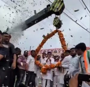 Bilaspur Chhattisgarh: छत्तीसगढ़ कांग्रेस प्रभारी सचिन पायलट का बिलासपुर में जोरदार और जोशीला स्वागत किया गया। एक कांग्रेस नेता ने बताया की कांग्रेस जनों ने सचिन जी को करीब 300 किलो की गजमाला पहनाकर सम्मानित किया। यह माला इतनी भारी थी कि इसे पहनाने के लिए क्रेन की मदद लेनी पड़ी।