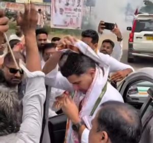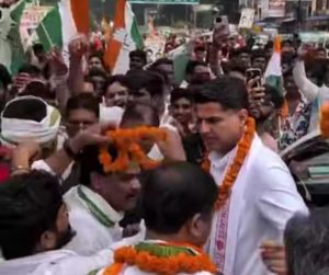 – सचिन पायलट को जब गजमाला पहनाई गई, तो वे पहले चौंक गए और फिर मुस्कुराते हुए स्वागत स्टेज पर पहुंचे। यहां कर्मा नृत्य और ढोल नगाड़ों की थाप से पूरा मामला खुशनुमा और जोशीला नजर आ रहा था। हर तरफ से कांग्रेस पार्टी जिंदाबाद के गगन भेदी नारे लग रहे थे।