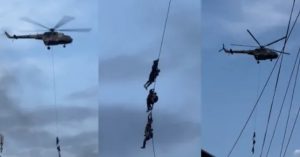 वीडियो में एक ऐसा दृश्य भी सामने आया जिसमे तीन नेता हेलीकॉप्टर की रस्सी पकड़ कर हवा में लटक कर सुरक्षित स्थान में जल्द से जल्द पहुंचना चाहते हैं।