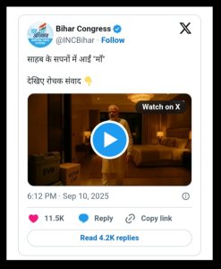 विवाद को शांत करने के बजाय, बिहार कांग्रेस ने ‘साहब के सपनों में आईं मां’ शीर्षक से एक AI वीडियो जारी किया गया है। इस वीडियो में पीएम मोदी और उनकी मां के किरदारों को दर्शाया गया है। वीडियो में दिखाया गया है कि पीएम मोदी की मां उनके सपने में आकर उन्हें बिहार चुनाव प्रचार में अपने नाम का इस्तेमाल करने के लिए डांट रही हैं। वह कहती हैं, ‘अरे बेटा, पहले तो तुमने हमें नोट बंदी की लंबी लाइनों में खड़ा किया, तुमने मेरे पैर धोने का रील बनवाया और बिहार में अब मेरे नाम पर राजनीति कर रहे हो। तुम मेरे अपमान के बैनर-पोस्टर छपवा रहे हो, राजनीति के नाम पर कितना गिरोगे?’