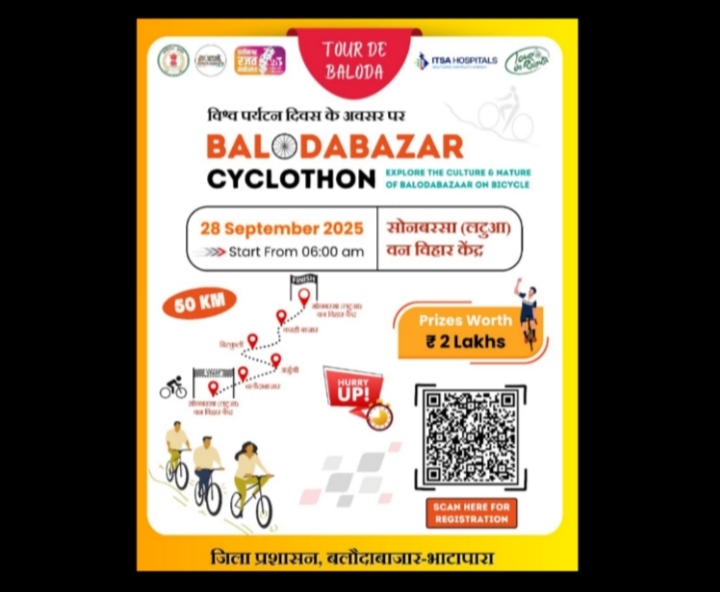 रायपुर, दिनांक 16 सितंबर 2025 :छत्तीसगढ़ रजत जयंती वर्ष और विश्व पर्यटन दिवस के अवसर पर बलौदाबाज़ार में 28 सितंबर 2025 को एक भव्य साइक्लोथॉन टूर दे बलौदा का आयोजन किया जाएगा। साइकिल रेस 28 सितंबर को सुबह 6 बजे से प्रारंभ होगी। इसके लिए 27 सितंबर को शाम 5 बजे जिला ऑडिटिरियम में ओरिएंटेशन वर्कशॉप और किट वितरित किया जाएगा। इस प्रतियोगिता में प्रदेश भर के 18 वर्ष से अधिक आयु के महिला और पुरुष साइक्लिस्ट शामिल हो सकते हैं। बलौदाबाज़ार- भाटापारा जिले के कलेक्टर, पुलिस अधीक्षक और वनमंडलाधिकारी ने सभी से इस आयोजन में बढ़-चढ़ कर हिस्सा लेने की अपील की है।