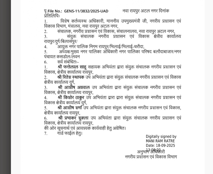 रायपुर। नगरीय प्रशासन विभाग ने दिसंबर 23 में नई सरकार बनने के बाद पिछली सरकार में हुई अनियमितताओं के लिए पिछले वर्ष निलंबित अभियंताओं को बहाल कर दिया है। आधा दर्जन अभियंताओं को नयी जगह पर पोस्टिंग दी है।