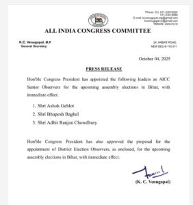 गौरतलब है कि बिहार में होने जा रहे विधानसभा चुनाव को लेकर कांग्रेस एक्शन मोड पर नजर आ रही है। वोट चोरी के मुद्दे को लेकर कांग्रेस लगातार बिहार सहित पूरे देश में बीजेपी और केंद्र सरकार को घेरने में जुटी हुई है।