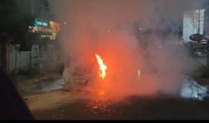 Raipur Chhattisgarh: रायपुर के अवंति विहार इलाके में शुक्रवार देर शाम एक इलेक्ट्रिक कार में अचानक आग लग गई। कार सड़क पर चल ही रही थी कि धुआं निकलने लगा और देखते ही देखते आग की लपटों ने पूरे वाहन को अपनी चपेट में ले लिया।