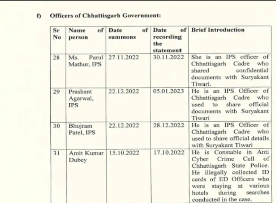 ईडी की चार्जशीट के मुताबिक तत्कालीन सीएम भूपेश बघेल की उप सचिव सौम्या चौरसिया और कोयला कारोबारी सूर्यकांत तिवारी सीनियर आईपीएस अफसर पारूल माथुर, आईपीएस प्रशांत अग्रवाल और आईपीएस भोजराम पटेल के संपर्क में थे। इन अफसरों पर आरोप है कि इन्होंने विभाग की ऑफिशियल जानकारी सूर्यकांत तिवारी को दी। वहीं महिला आईपीएस अफसर पारूल माथुर पर इस घोटाले के मास्टर माइंड सूर्यकांत तिवारी के कहने पर कोयला लेकर जा रहे वाहनों पर एक्शन लेने का आरोप है। चार्जशीट में बताया गया है तिवारी के इशारे पर महिला अफसर कोल वाहनों पर एक्शन लेती थी। वहीं कॉन्स्टेबल अमित कुमार दुबे पर ईडी के अफसरों की जासूसी करने का आरोप है। कोर्ट में पेश इस चार्जशीट में किये गये इन खुलासों के बाद एक बार फिर ब्यूरोक्रेसी में हड़कंप मचा हुआ है।