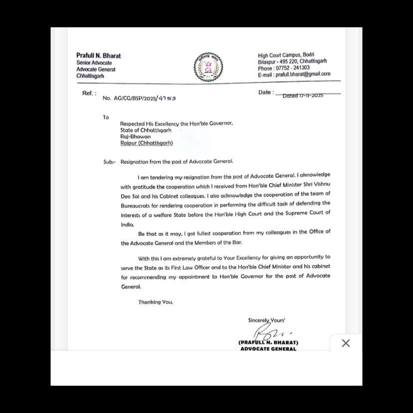 CG News:छत्तीसगढ़ सरकार के महाधिवक्ता प्रफुल्ल एन. भारत ने अपने पद से इस्तीफा दे दिया है। उन्होंने राज्यपाल रामेन डेका को अपना इस्तीफा सौंपा है। प्रफुल्ल भारत ने अपने इस्तीफे में मुख्यमंत्री विष्णुदेव साय और उनके मंत्रिमंडल के सहयोगियों के प्रति आभार व्यक्त किया है। उन्होंने उच्च न्यायालय और सर्वोच्च न्यायालय के समक्ष कल्याणकारी राज्य के हितों की रक्षा के कठिन कार्य में सहयोग देने के लिए नौकरशाहों की टीम के प्रति भी आभार व्यक्त किया है