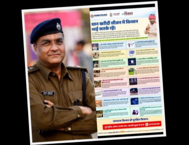 दुर्ग: धान खरीदी सीजन में किसानों की आर्थिक सुरक्षा को सर्वोच्च प्राथमिकता देते हुए दुर्ग पुलिस द्वारा व्यापक जागरूकता पोस्टर जारी किया गया है। जिला पुलिस अधीक्षक विजय अग्रवाल ने सभी नागरिकों से अनुरोध है कि इस संदेश को अधिक से अधिक किसानों तक पहुँचाकर सहयोग प्रदान करें।