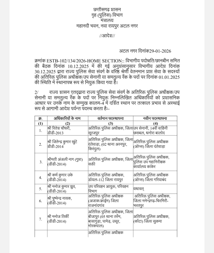 शासन द्वारा यह प्रशासनिक आदेश 30 दिसंबर, 2025 को जारी किया गया। इस निर्णय के बाद विभाग में बड़े पैमाने पर फेरबदल और पदोन्नति का रास्ता साफ हो गया है। माना जा रहा है कि इस बदलाव से नए साल में प्रदेश की कानून व्यवस्था और पुलिसिंग को नई ऊर्जा मिलेगी।