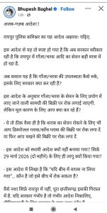 रायपुर। छत्तीसगढ़ के पूर्व मुख्यमंत्री और कांग्रेस के वरिष्ठ नेता भूपेश बघेल ने रायपुर पुलिस कमिश्नर द्वारा जारी एक हालिया आदेश पर तीखा हमला बोला है। सोशल मीडिया के माध्यम से सरकार को घेरते हुए बघेल ने इस आदेश को ‘अजब-गजब’ करार दिया और नशा मुक्ति के सरकारी प्रयासों पर गंभीर सवाल खड़े किए हैं।