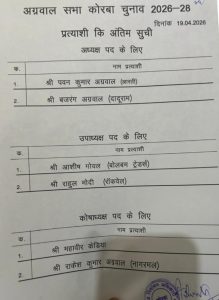 कोरबा 19 अप्रैल। अग्रवाल सभा कोरबा के आगामी कार्यकाल (वर्ष 2026-28) के लिए चुनावी सरगर्मी अपने चरम पर पहुंच गई है। मुख्य निर्वाचन अधिकारी द्वारा रविवार, 19 अप्रैल 2026 को प्रत्याशियों की आधिकारिक अंतिम सूची जारी कर दी गई है, जिससे अब चुनावी मैदान की तस्वीर पूरी तरह साफ हो गई है।