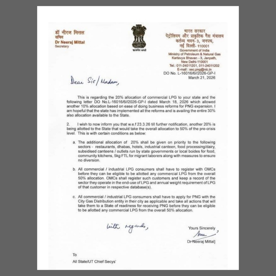 //भारत सरकार के पेट्रोलियम और प्राकृतिक गैस मंत्रालय ने राज्यों और केंद्र शासित प्रदेशों के लिए कमर्शियल एलपीजी (LPG) के आवंटन में भारी बढ़ोतरी करने का निर्णय लिया है। सचिव डॉ. नीरज मित्तल द्वारा जारी एक आधिकारिक पत्र के अनुसार, अब राज्यों को प्री-क्राइसिस (संकट पूर्व) स्तर का कुल 50% आवंटन प्राप्त होगा। इससे पहले … Read more